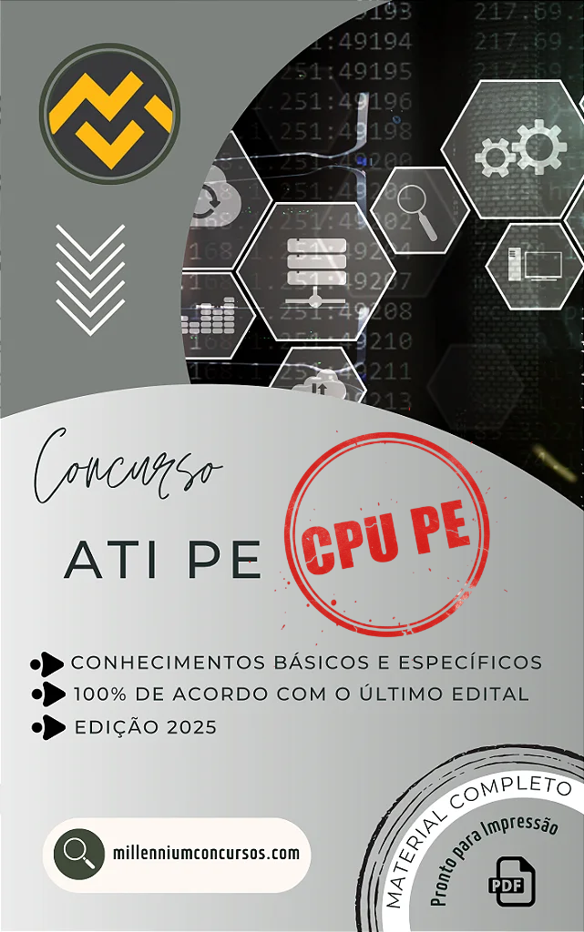 APOSTILA CPU PE 2025 AGÊNCIA ESTADUAL DE TECNOLOGIA DA INFORMAÇÃO DE PERNAMBUCO - ANALISTA EM GESTÃO DE TECNOLOGIA DA INFORMAÇÃO E COMUNICAÇÃO - ANALISTA DE APLICAÇÕES DE TECNOLOGIA DA INFORMAÇÃO E COMUNICAÇÃO. Material completo que abrange tanto os conteúdos de conhecimentos básicos quanto os específicos exigidos no edital para esse cargo.