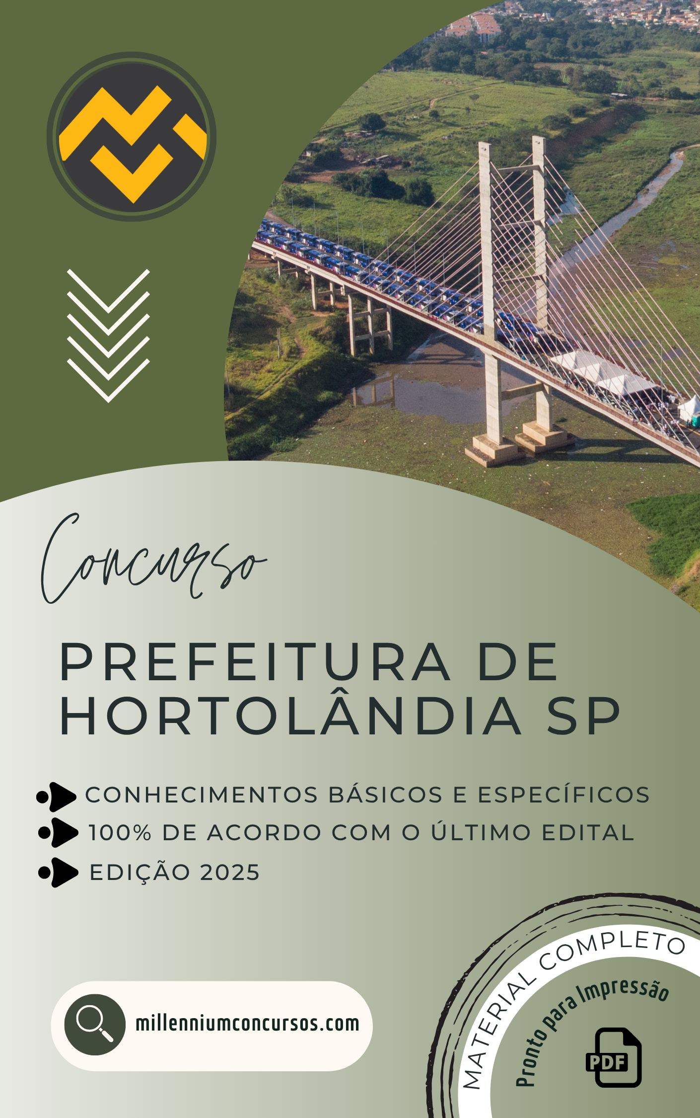APOSTILA PREFEITURA DE HORTOLÂNDIA SP 2025 ANALISTA DE DESENVOLVIMENTO DE SISTEMA. Material completo que abrange tanto os conteúdos de conhecimentos básicos quanto os específicos exigidos no edital para esse cargo.